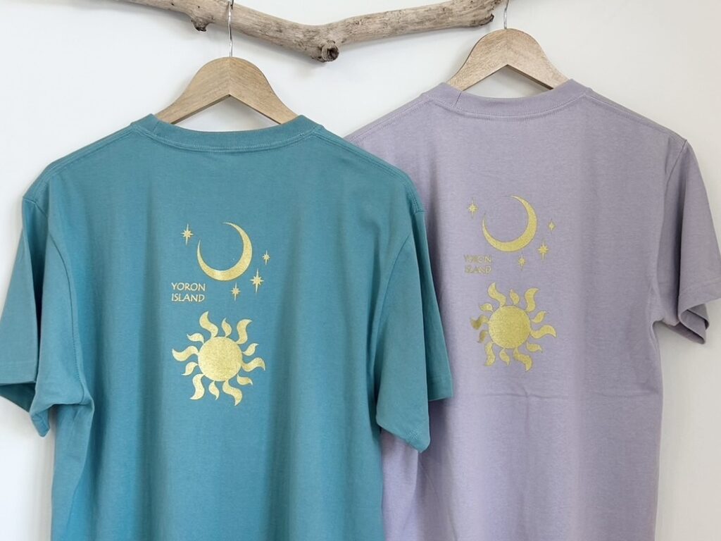 月と太陽をモチーフにした、ヨロンエマのオリジナルTシャツ。好評につき、何回か再販しています。ありがとうございます!エマの仲間「ひーじゃ」の、月と太陽のTシャツ欲しい〜の一言で速攻作ったんですが、次のリクエストにまだ答えていない・・・もうちょい待ってね!