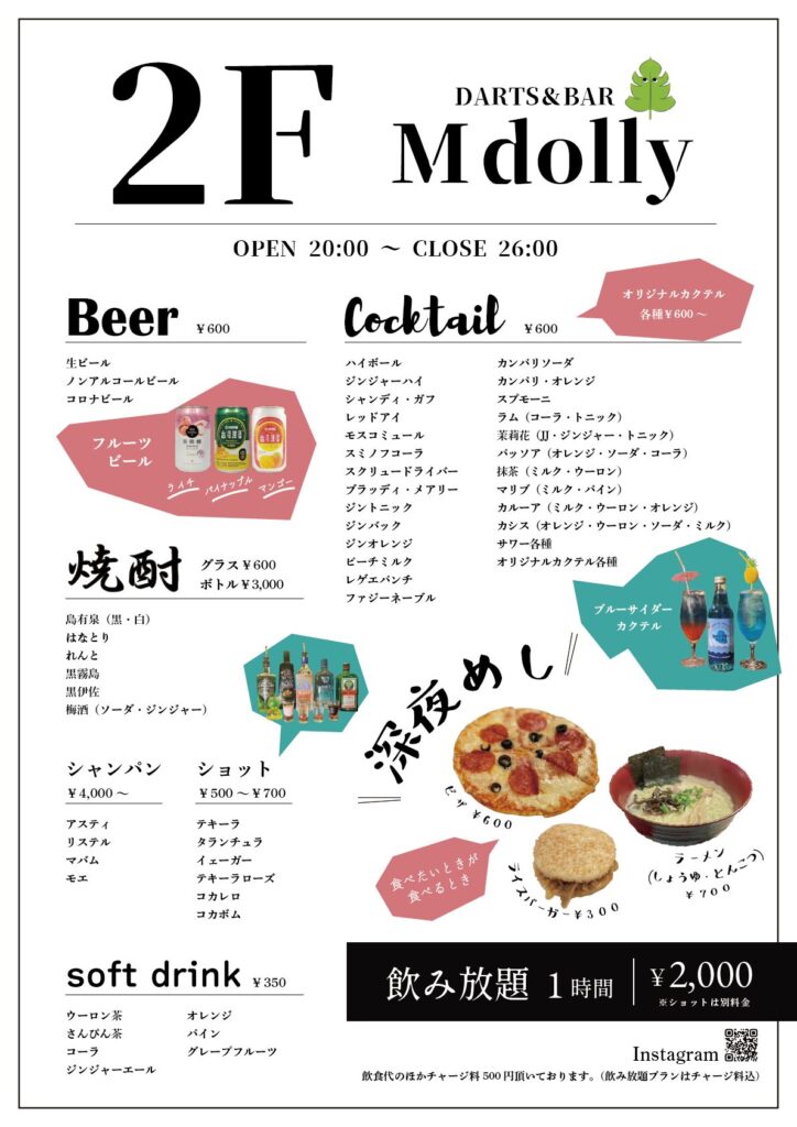 与論島のBar「Mdolly」さんの店頭用メニューポスター。店頭にあるピンクとターコイズカラーの看板に合わせた色使いでデザインしました。店主のみどりさんは気さくで話しやすいので女性も入りやすい♪与論で唯一のダーツバーですが、ダーツしなくても大丈夫なので、飲み足りない人、夜中に小腹が減っちゃった人はぜひぜひ!場所は銀座通りの真ん中くらい。カラフルな絵が描いてある階段と、このメニューポスターが目印ですよ〜!